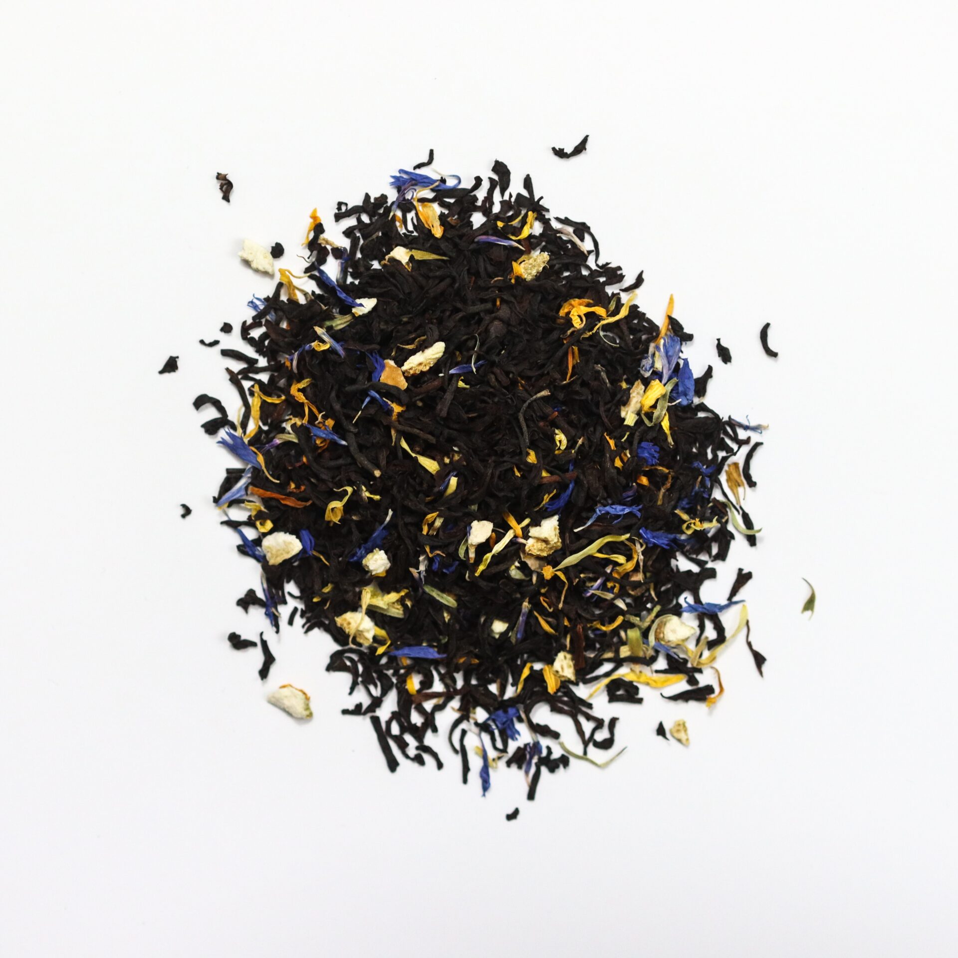 Ingredients Organic black tea, organic orange peel, organic mallow flowers, organic blue cornflower, organic rose petals, organic bergamot oil, organic rose oil, organic orange oil