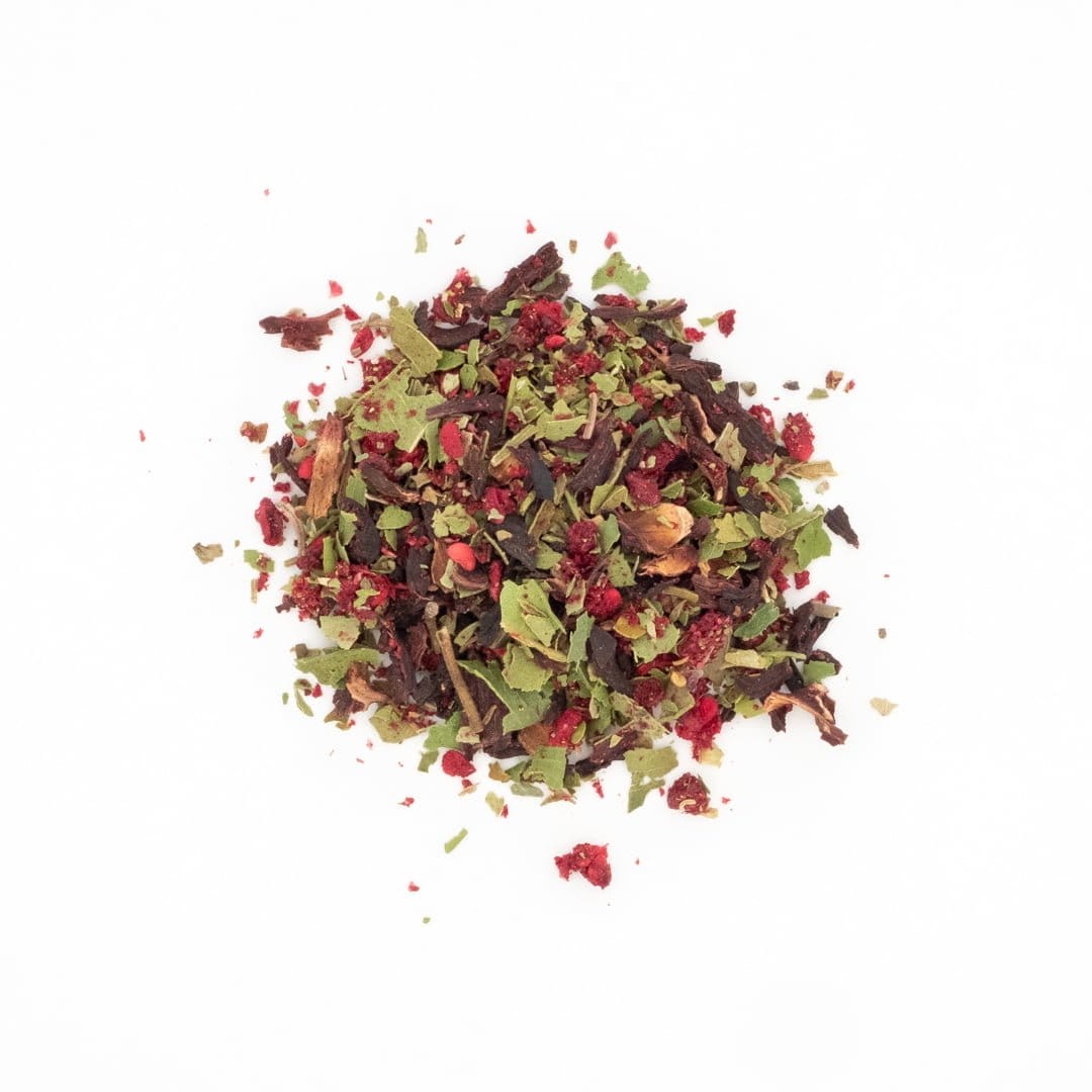 Ingredients: Organic native lemon myrtle, organic rosella (hibiscus), blackberry, native basil, native strawberry gum, native river mint, organic dandelion root