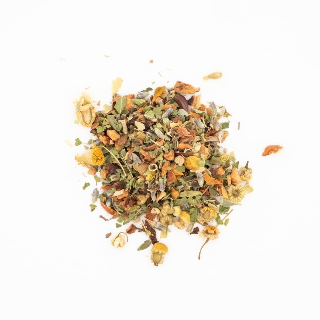 Night Time Tea Certified Organic (Night Lights) – A soft and smooth tea designed to calm the mind and help to induce sleep. The key to this blend is the ayurvedic blend of hops, lavender and valerian root, supported by lemon verbena and linden leaf. It’s rounded out with chamomile and flavoured with apple and cinnamon. A calming and relaxing blend this tea is a popular functional blend and one of our best sellers.